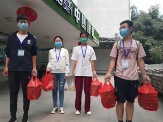 (图注:党员防疫先锋队为封闭管理的学生提供送餐服务。)