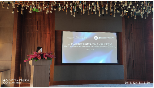 2019年12月18日下午,澳门新莆京游戏大厅版本酒店管理专业第三届国际柏悦人才班在太阳湾柏悦酒店会议厅举办隆重的开班仪式。开班仪式由柏悦酒店人事总监项红娟女士主持,酒店总经理、各部门总监、澳门新莆京游戏大厅版本副院长陈德广、酒店管理系主任金磊、第三届柏悦班班主任杨经梓以及全体第三届柏悦班学员出席了开班仪式。