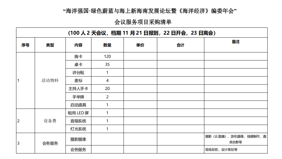 “海洋强国·绿色蔚蓝与海上新海南发展论坛暨《海洋经济》编委年会”会议服务项目采购,详情见海南热带海洋学院“海洋强国·绿色蔚蓝与海上新海南发展论坛暨《海洋经济》编委年会”会议服务项目采购清单。