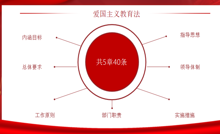 《中华人民共和国爱国主义教育法》共五章四十条,包括总则、职责任务、实施措施、支持保障、附则。其内容广泛,涵盖了思想政治、历史文化、国家标志、祖国河山和历史文化遗产、宪法和法律、国家统一和民族团结、国家安全和国防、英烈和模范人物事迹等方方面面。