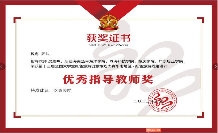 由文化和旅游部资源开发司等单位主办,中国旅游协会旅游教育分会、北京第二外国语学院等单位承办以“激扬青春梦 奋进新时代”为主题的第十三届全国大学生红色旅游创意策划大赛(以下简称“红旅大赛”)近日公布初赛获奖名单。其中,澳门新莆京游戏大厅版本学生李苑茵、牟颖喆等人组成的团队“探粤”完成的红色旅游线路策划方案《“元”创 百年红粤,“研”探乡村振兴》荣获华南赛区二等奖!吴素吟老师荣获“优秀指导老师奖”!